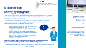 Dazu werden zunächst die Grundlagen des Berechtigungsmanagements erläutert (was sind Identitäten und Accounts, Berechtigungen, Rollen, …). Anschließend werden typische Prozesse im Berechtigungsmanagement beleuchtet, Hintergründe zu den regulatorischen Anforderungen an das Berechtigungsmanagement gegeben, die firmeninterne Regulatorik (Verantwortlichkeiten, Richtlinien, …), der Umgang mit privilegierten Accounts erläutert, die sinnvollste Zusammenstellung von Berechtigungen diskutiert, Risiken durch toxische Berechtigungskombinationen betrachtet sowie einige weitere in Verbindung stehende Themen beleuchtet und in großen Teilen durch die Studierenden mittels eines Praixsbeispiels in Form eines Praktikums nachvollzogen.