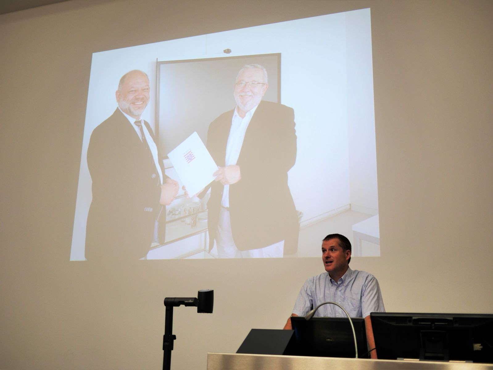 Am 27.09.2018 wurde Prof. Dr. Christoph Wentzel in den Ruhestand verabschiedet. Im Hörsaal waren nur noch wenige Plätze frei, als das OBO – Towermusic Duo mit Gitarrenklängen die Gäste auf den Abend einstimmte. Prof. Dr. Harald Baier machte den Anfang, in dem er in seiner Rede die großen Verdienste von Christoph Wentzel für den Fachbereich Informatik würdigte. Der Präsident der Hochschule, Prof. Dr. Ralph Stengler, würdigte in seinem Grußwort die Verdienste von Christoph Wentzel während seiner Zeit als Präsident der Hochschule. Rainer Göttmann als langjähriger Weggefährte von Christoph Wentzel, insbesondere während dessen Zeit als Leiter SAP-Einführung an den hessischen Hochschulen, verriet so manches Geheimnis aus gemeinsam geführten Verhandlungen. Der Dekan des Fachbereichs Informatik, Prof. Dr. Stephan Karczewski, resümierte die Stationen von Christoph Wentzel von seiner Dekanatsarbeit im Fachbereich über die Leitung und Organisation der SAP-Einführung der Hochschulen in Hessen bis hin zu seiner Präsidiumszeit an der Hochschule Darmstadt. Am Ende wünschte er Herrn Wentzel einen guten (Un-) Ruhestand mit gelegentlichen Lehraufträgen am Fachbereich und überreichte ihm im Auftrag des gesamten Fachbereichs einen Gutschein für eine Reise.