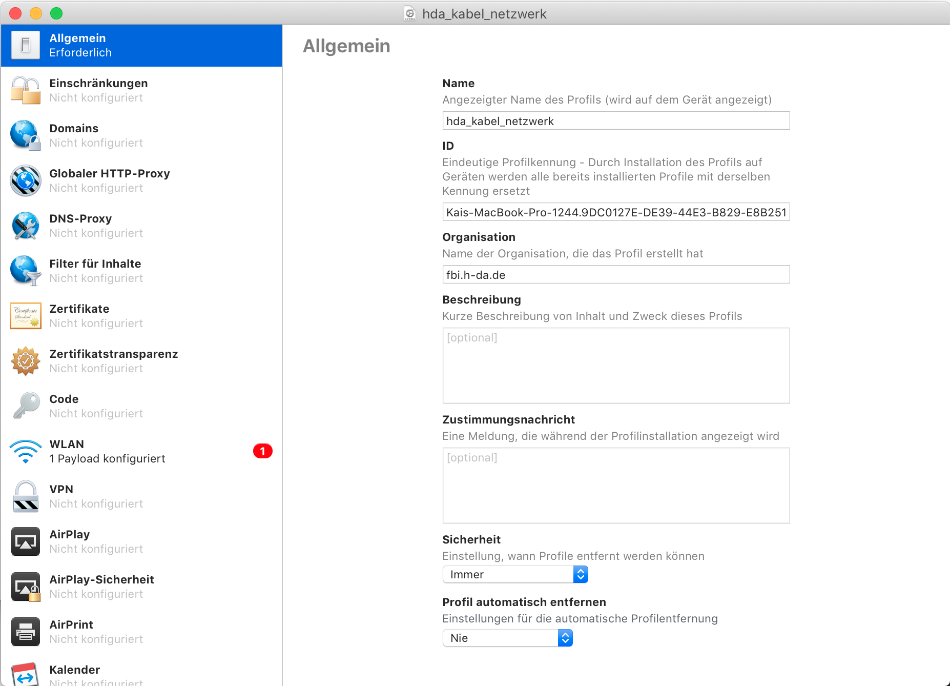 - Das Profil speichert man ab. (Es kommt eine Warnung, dass nicht alles ausgefüllt ist, diese Warnung kann man ignorieren.) Es ensteht eine Datei mit der Endung .mobileconfig