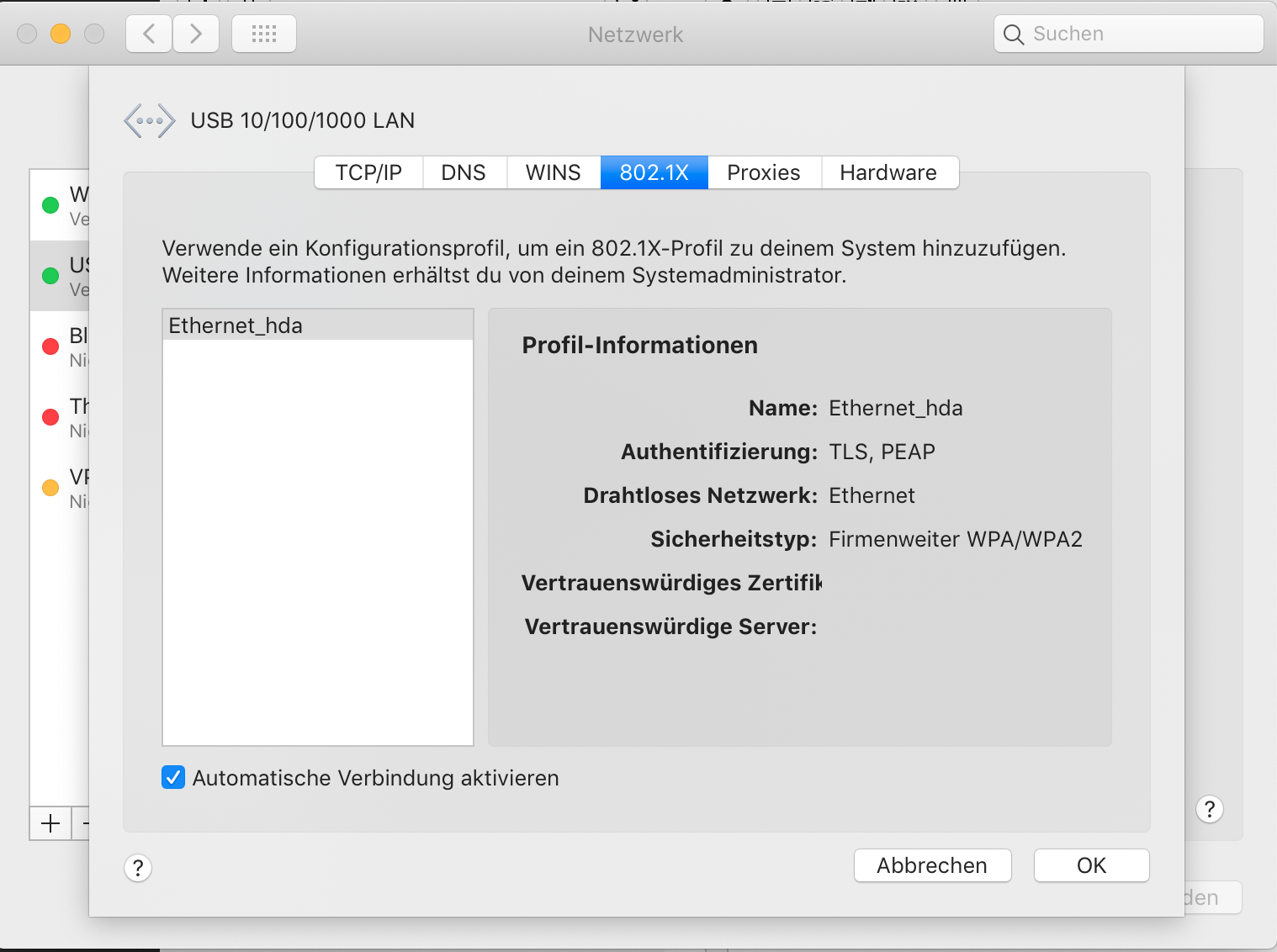 - In den Systemeinstellungen kann man dann für den LAN-Adapter das Profil im Reiter 802.1x auswählen (Screenshot unten)