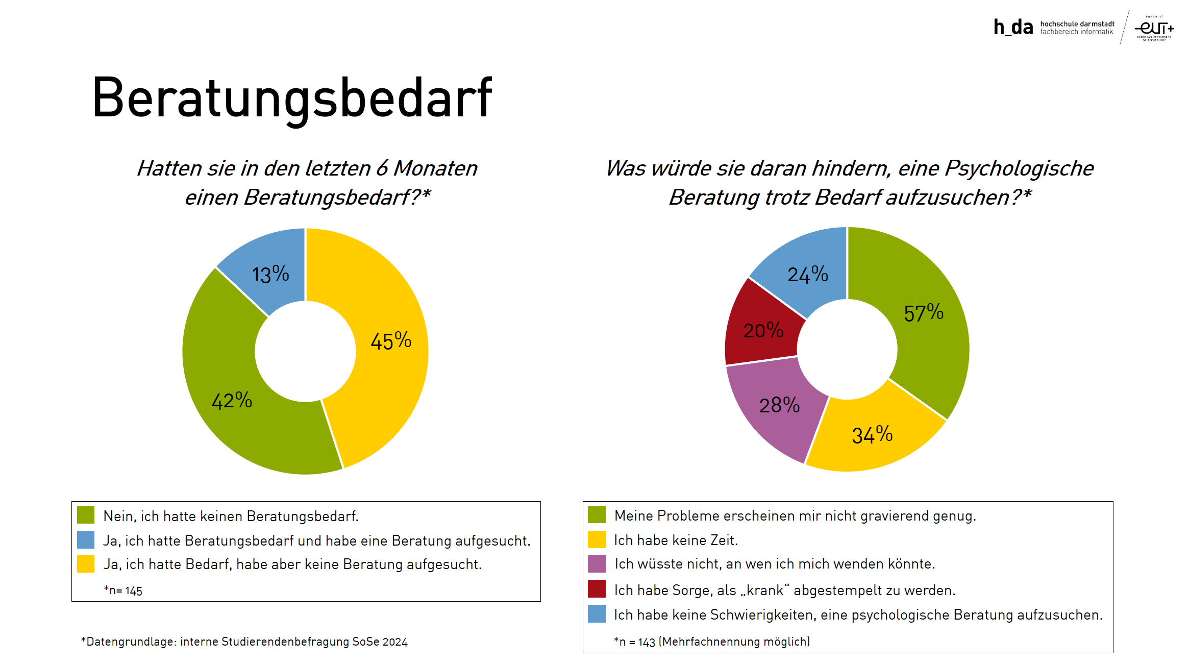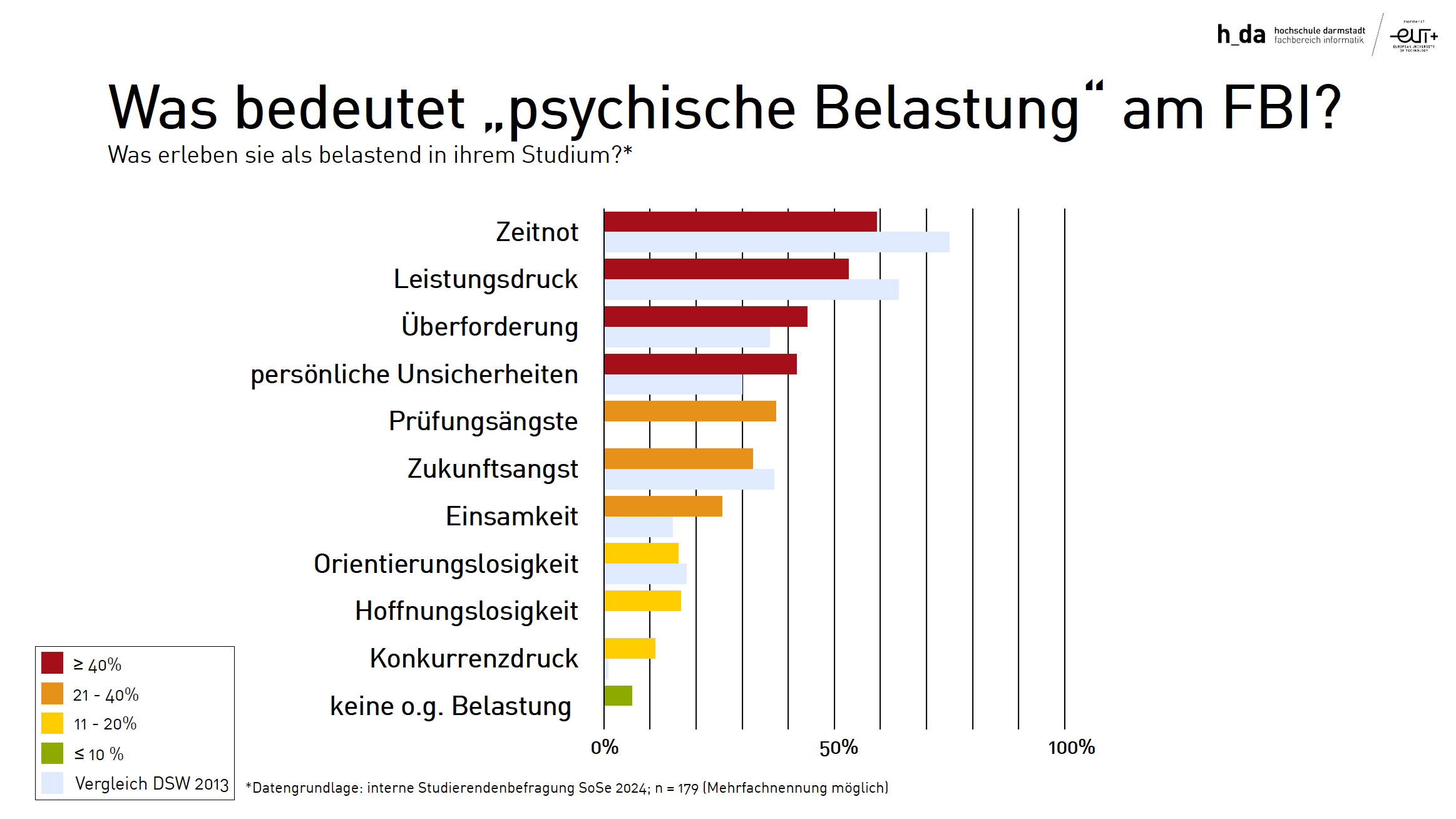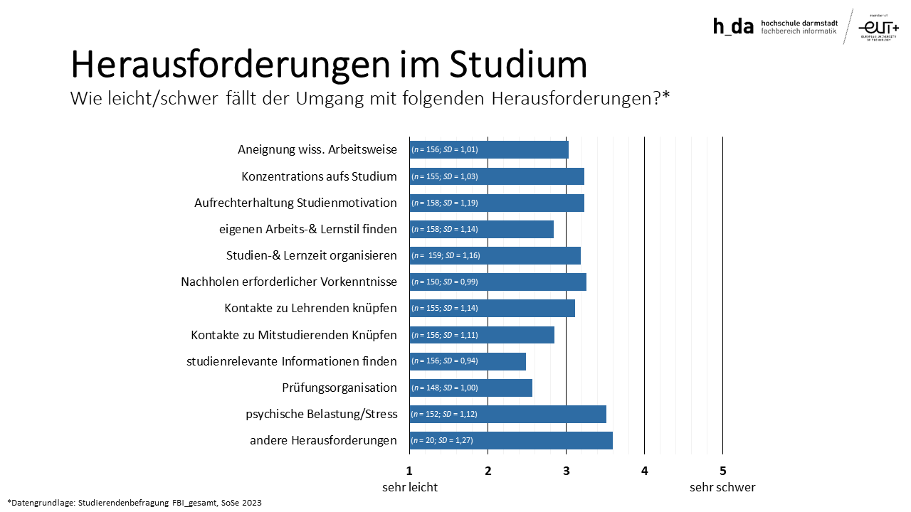 Im Studium gibt es viele Herausforderungen. Es ist ganz normal, diese nicht alle auf Anhieb bewältigen zu können. Damit sind Sie nicht allein! Schauen Sie selbst in die Ergebnisse der Studierendenbefragungen: So geben z.B. über die Hälfte aller Studierenden am FBI an, die Bewältigung von psychischen Belastungen als sehr herausfordernd zu erleben. Was dabei als belastend erlebt wird, kann sehr unterschiedlich sein. Wenn es Ihnen auch so geht, melden Sie sich gerne in der ►Psychologischen Beratung am FBI oder sprechen Sie mit Freund*innen, Partner*innen oder ihrer Familie über das, was sie belastet. Reden hilft!