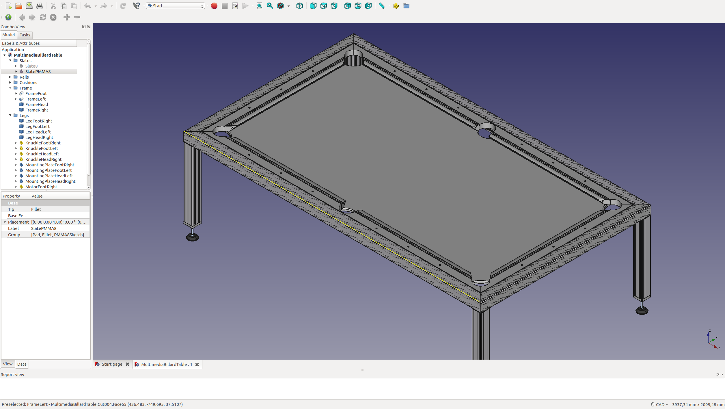 Bei unserem Billardtisch wollen wir Rückprojektion einsetzen, das heißt von unten auf das Billardtuch projizieren. Anstatt der Schieferplatte wollen wir eine Plexiglasplatte einsetzen. Der Tisch soll multifunktional nutzbar sein, da wir keinen Raum dauerhaft damit belegen können. Erste Überlegungen zum Hochklappen und dann zur Seite schieben wurden als zu komplex/zu gefährlich verworfen, stattdessen folgen wir vom Mindset dem "fusion table" aus Belgien (https://www.fusiontables.com). Bei diesem Tisch ist der Billardtisch normalerweise nicht zu sehen und sieht wie ein Esstisch aus. Auf uns übertragen wollen wir einen Meetingraumtisch zum Billardtisch konvertieren - Tischplatte abheben und auf Billardhöhe anheben (lassen).