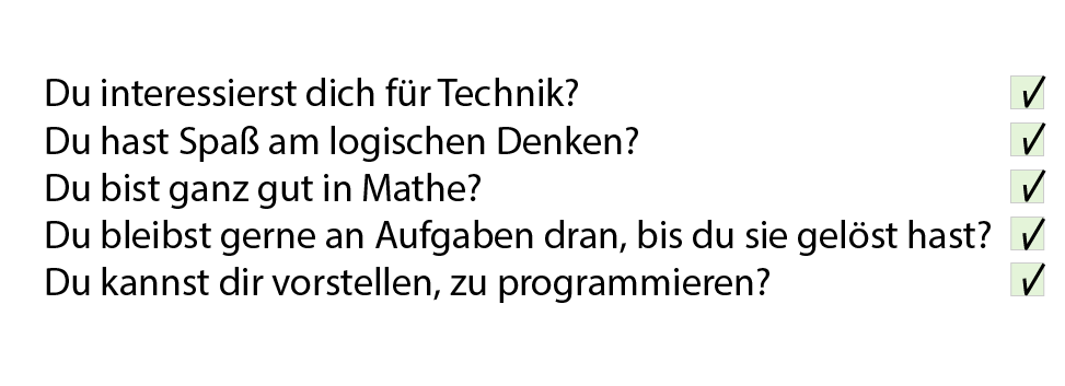Mathe-LK ist keine Voraussetzung – du solltest ein gutes mathematisches Verständnis haben, logisch denken können, neugierig und technik-begeistert sein. Es macht dir Freude, kompliziertere Dinge lernen zu wollen und Neues zu entdecken.